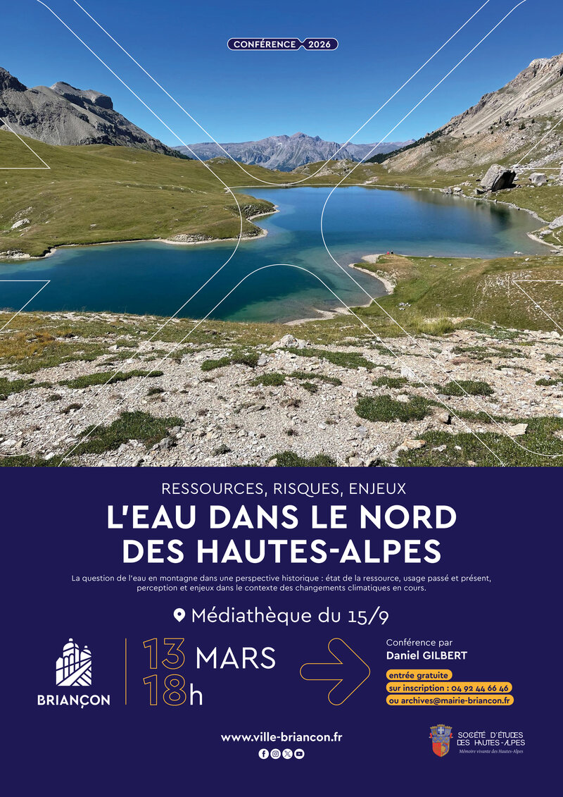 Vendredi 13 mars à 18H. Conférence : L'eau dans le nord des Hautes-Alpes. Médiathèque du 15/9. Briançon.