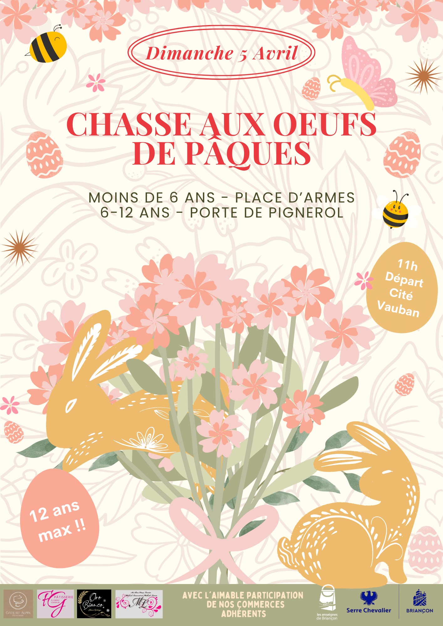 Dimanche 5 avril à 11h. Chasse aux oeufs. Porte de Pignerol. Affiche.